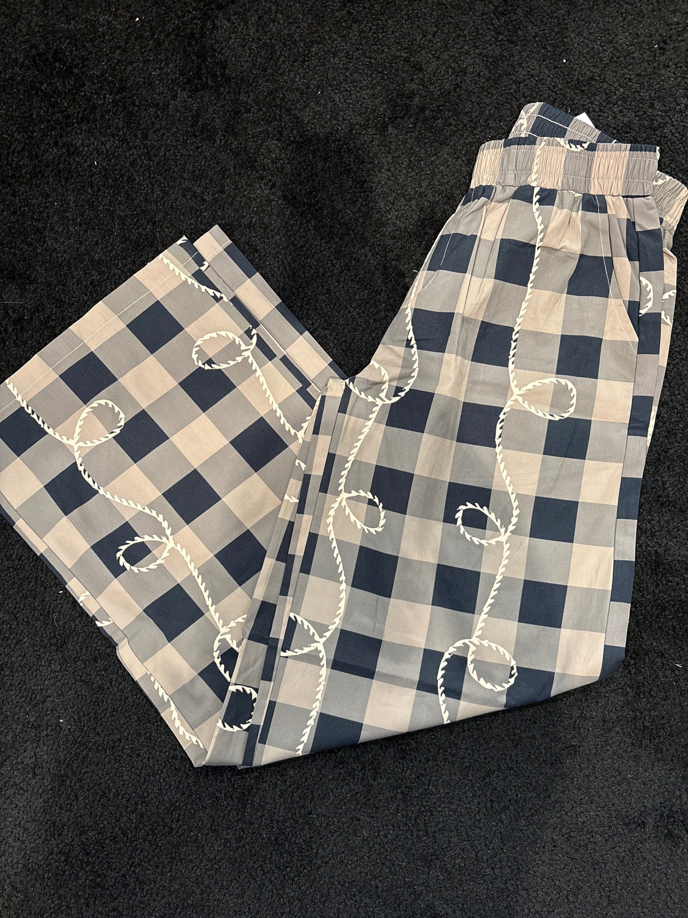 Easy, Breezy, and full of Charm-the Rope & Gingham Wide-Leg Pants are a standout staple with a playful ranch twist. Featuring a soft elastic waistband for all-day comfort, these pants showcase a classic navy-and-taupe gingham base layered with a subtle rope print for that unmistakable cowgirl detail. The relaxed wide-leg silhouette flows beautifully, making them perfect for casual days, market strolls, or styled up for a statement outfit.