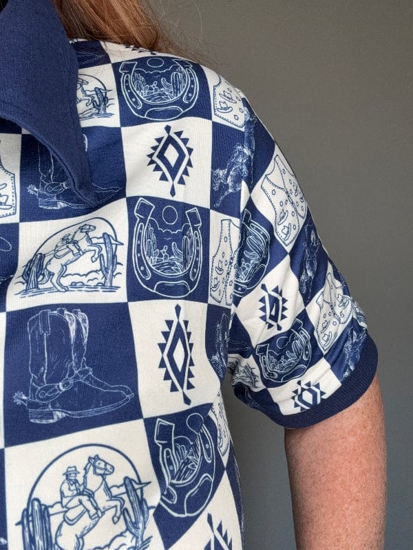 Navy & Cream check polo showcases cowboy boots, saddles, horseshoes and Western icons in a pactchwork design. The structured knit collar and sleeve cuffs balance comfort with polish, making it a standout piece. Style with turquoise jewelry and jeans for a modern take on classic.